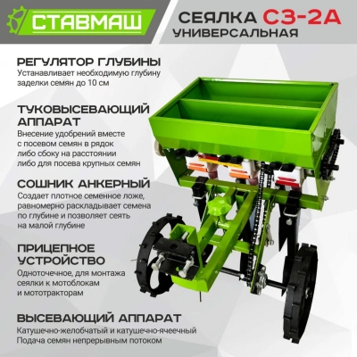 Сеялка предназначена для посева семян зерновых культур (пшеница, рожь, ячмень, овес), бобовых культур (горох, фасоль, соя, чечевица, бобы), близких к зерновым по размерам семян и нормам высева (гречиха, просо, сорго), бахчевых культур (арбуз, дыня, кабачок), технических культур (кукуруза, подсолнечник, свекла), а также кормовые травы и травы медоносы (фацелия, люцерна, суданка, эспарцет, донник). Сеялку можно переоборудовать для посева ряда овощных культур, но это уже требует изменений в конструкции. Сеялка агрегатируется с мотокультиваторами и мотоблоками мощностью от 4 до 7 л.с. Одновременно с высевом происходит дозированное внесение в рядки гранулированных минеральных удобрений.