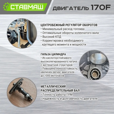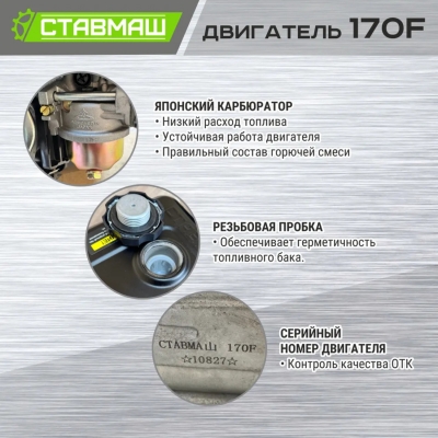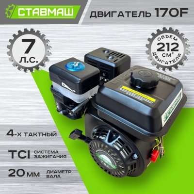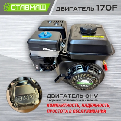 Двигатель "Ставмаш" 170F универсальный – является карбюраторным с искровым зажиганием двигателем внутреннего сгорания и с возвратно-поступательным движением поршня, 4-хтактный, одноцилиндровый с воздушным охлаждением . Устанавливаться на коммунальное, строительное оборудование и сельскохозяйственные машины малой механизации такие, как: мотокультиваторы и мотоблоки, мотопомпы, снегоуборщики, бензогенераторы, виброплиты, вибротрамбовщики, резчики швов, воздушные компрессоры, затирочные машины и другую строительную, садовую и сельскохозяйственную технику.