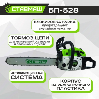 Бензопила Ставмаш БП528 – сравнительно лёгкий, компактный инструмент, позволяющий справляться со сложными задачами, где важна точность реза. БП528 - модель со средней мощностью двигателя, легко режет дрова, справляется с валкой небольших и средних деревьев.Цепь модели БП528 имеет 72 звена(45см), чего достаточно для глубокого реза. Чтобы предотвратить риск травмирования цепью, в компоновке данного инструмента использована защита – система инерционного торможения. Бензопила оборудована автоматической системой смазывания цепи, что полностью исключает её растяжение, а также перегрев и деформацию шины.Тип стартера - ручной с системой облегченного запуска(легкий старт).
