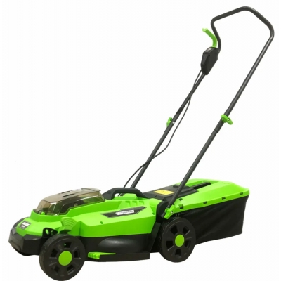 Высота скашивания имеет 3 ступеней: от 30 до 70 мм. Дека газонокосилки выполнена из ударопрочного пластика, устойчивого к попаданию посторонних предметов, таких как небольшие камни или щебень. Для безопасного использования модель оснащена ключом безопасности и кнопкой-предохранителем от случайного включения. высокая маневренность обеспечивается колесами с протектором, для компактного хранения у устройства предусмотрена складная ручка. Модель работает от аккумуляторной батареи 24V.