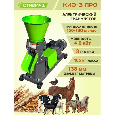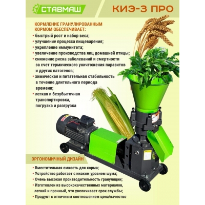 Электрический гранулятор кормов Ставмаш КИЭ-3ПРО - машина для приготовления, переработки зерновых кормов (пшеницы, кукурузы, ячменя, ржи, масленичных культур, бобов, сена, растительных отходов и т.д.) в мелкие гранулы, (пеллеты) для кормления кроликов, птиц, овец, крупного рогатого скота, свиней или рыб.