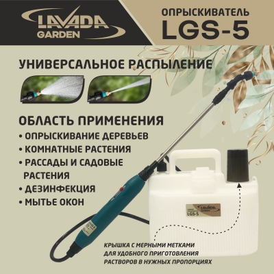 Опрыскиватель аккумуляторный LAVADA LGS-5 - это новейший тип семейного многофункционального садового опрыскивателя. Благодаря совершенно новому дизайну, он переосмысливает садовый опрыскиватель на батарейках и стал большим удовольствием в семейной жизни.
