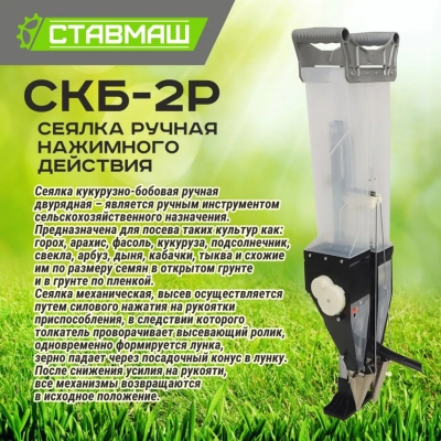 Сеялка нажимная однорядная СКБ-2Р предназначена для посева различных культур таких как горох, арахис, фасоль, кукуруза, подсолнечник, свекла, арбуз, дыня, кабачок, тыква. Она подходит как для открытого грунта, так и для грунта под пленкой. Высев осуществляется путем силового нажатия на рукоятки, в результате чего толкатель проворачивает высевающий ролик и формируется лунка. Зерно попадает через посадочный конус в лунку. Можно высевать по 1, 2 или 3 семени в лунку одновременно, регулировка происходит путем перестановки заслонки. Глубина заделки семян регулируется от 40 до 75 мм. Сеялку СКБ-2Р можно приспособить для посева практически любых культур, что делает ее универсальным инструментом для садоводов и фермеров.
