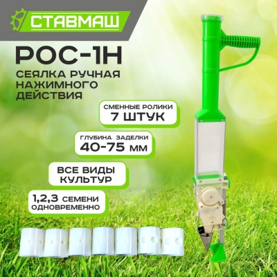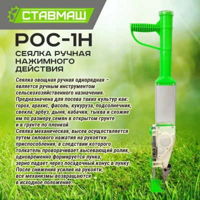 Сеялка овощная РОС-1Н ручная однорядная – является ручным инструментом сельскохозяйственного назначения, предназначена для посева культур таких как горох, арахис, фасоль, кукуруза, подсолнечник, свекла, арбуз, дыня, кабачок, тыква и схожие им по размеру семян как в открытом грунте так и в грунт под пленкой. Сеялка механическая, высев осуществляется путем силового нажатия на рукоятку приспособления, в следствии которого толкатель проворачивает высевающий ролик одновременно формируется лунка, зерно падает через посадочный конус в лунку. После снижения усилия на рукоятки все механизмы возвращаются в исходное положение. В комплект входят сменные ролики 7 шт. Можно высевать одновременно по 1, 2 или 3 семени в лунку. Глубина заделки семян регулируется от 40-75мм. Сеялку можно приспособить для посева практически всех видов культур.