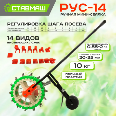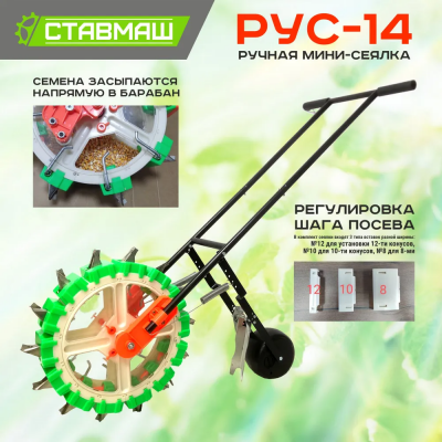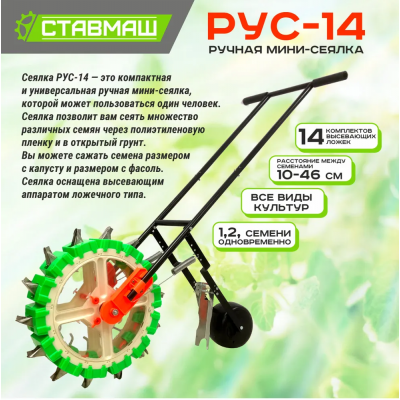Сеялка РУС-14 — это компактная и универсальная ручная мини-сеялка, которой может пользоваться один человек. Сеялка позволит вам сеять множество различных семян через полиэтиленовую пленку и в открытый грунт. Вы можете сажать семена размером с капусту и размером с фасоль.