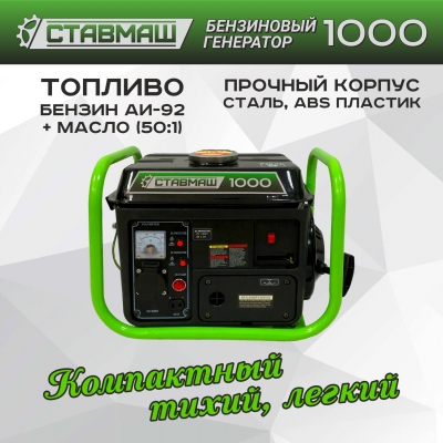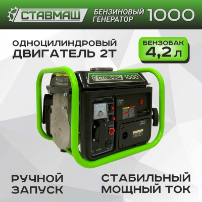 Ставмаш 1000 - бензиновый генератор синхронного типа, с двухтактным двигателем и суммарной мощностью подключаемых потребителей 950 Вт.