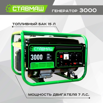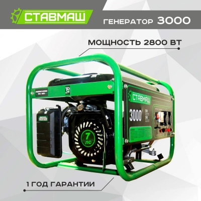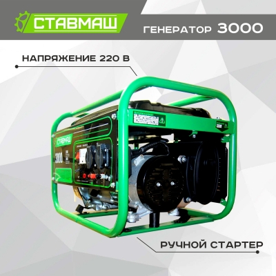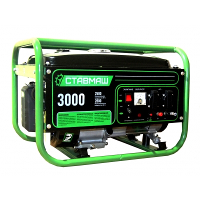 Ставмаш 3000 - бензиновый генератор синхронного типа, с четырехтактным двигателем и суммарной мощностью подключаемых потребителей 2800 Вт.