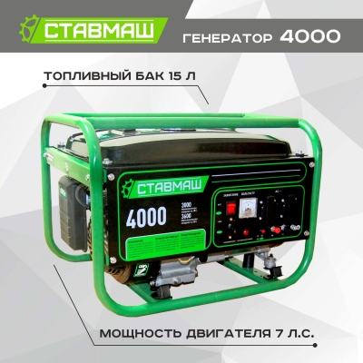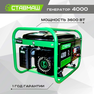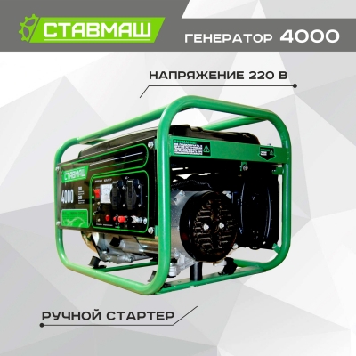 Ставмаш 4000 - бензиновый генератор синхронного типа, с четырехтактным двигателем и суммарной мощностью подключаемых потребителей 3600 Вт.