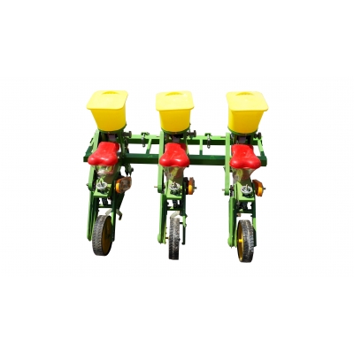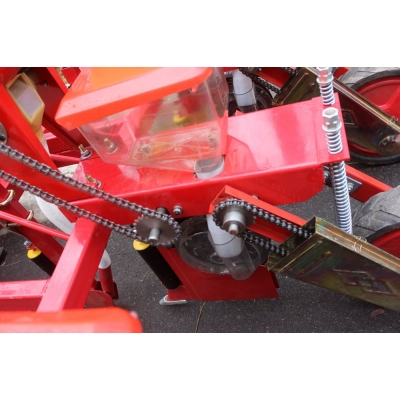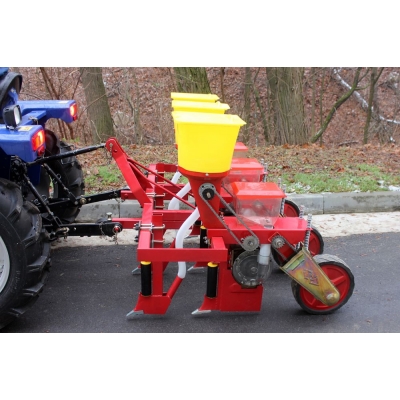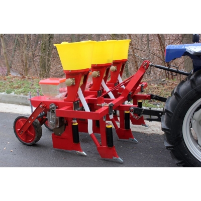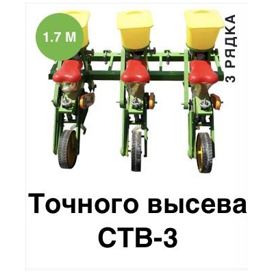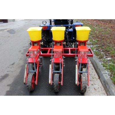 Сеялка точного высева навесная. Предназначена для посева пропашных технических культур, таких как: кукуруза, подсолнух, свекла, горох, соя и схожих им культур по фракции семян и агротехническим требованиям. В наличии 3-х (1,7м ширина), 4-х (2,4м ширина), 5-ти (3м ширина) сеялки. Максимальная ширина междурядья 70см., минимальная 30см. Глубина заделки семян регулируемая, до 10см. Шаг посева регулируется с помощью 8 ступенчатого шестеренчатого редуктора и путем перестановки местами пары звездочек. Всего получается 16 передач. Минимальный шаг и кратность высева 3см. Привод высевающего аппарата выполняется от опорного колеса секции через цепную передачу. Одновременно с посевом семян можно вносить гранулированные минеральные удобрения. Гарантия 1 год.