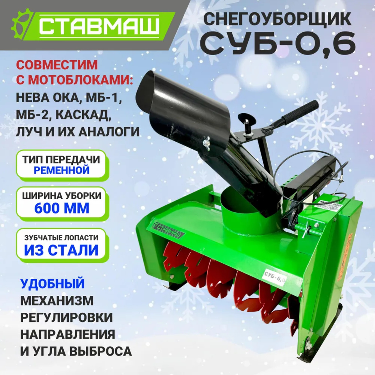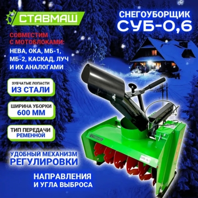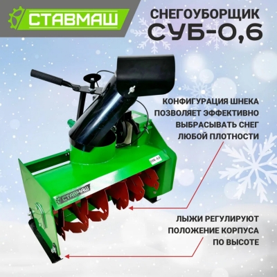 СУБ-0,6 также отличается низким уровнем ухода и простым обслуживанием, что делает его удобным выбором для любого владельца. В сочетании с мотоблоком, этот снегоуборщик превращает тяжелую работу по очистке в простую и быструю задачу. Вы сможете легко поддерживать свою территорию в чистоте и обеспечивать безопасность передвижения.