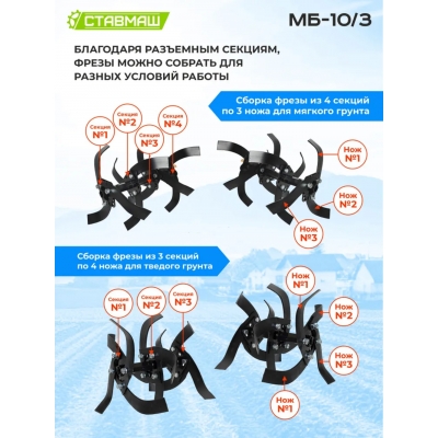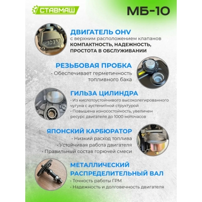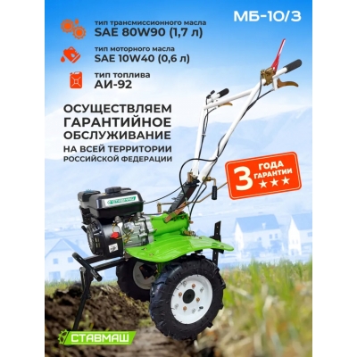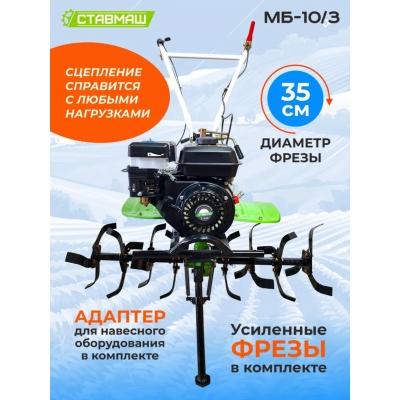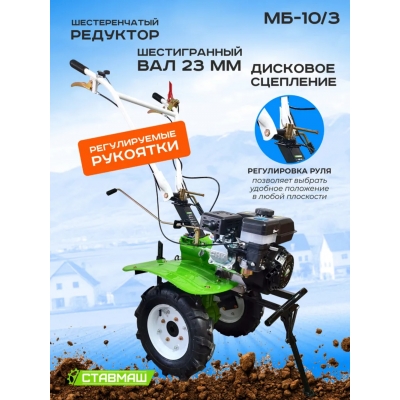 Мотоблок Ставмаш МБ-10/3 бензин 7 л.с. 3 скорости с повышенным запасом прочности. Оснащен валом отбора мощности (ВОМ), многодисковым сцеплением в масляной ванне и шестеренчатым редуктором. 3-х ступенчатая трансмиссия позволяет выбрать режим обработки почвы. Укрепленная рама с универсальной сцепкой - для установки навесного оборудования или использования тележки. К ВОМ можно подключить активное оборудование.