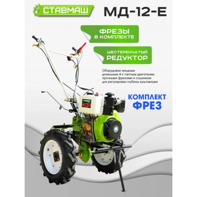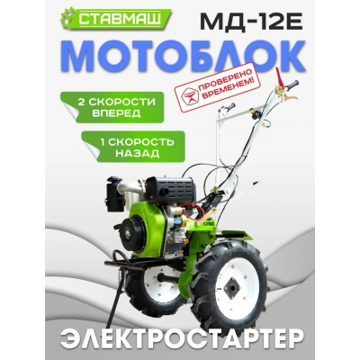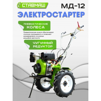 Мотоблок Ставмаш МД-12Е дизель 9 л.с. ЭЛЕКТРОСТАРТЕР с повышенным запасом прочности. Оснащен валом отбора мощности (ВОМ), многодисковым сцеплением в масляной ванне и шестеренчатым редуктором. 2-х ступенчатая трансмиссия позволяет выбрать режим обработки почвы. Укрепленная рама с универсальной сцепкой - для установки навесного оборудования или использования тележки. К ВОМ можно подключить активное оборудование.