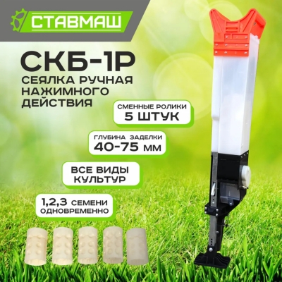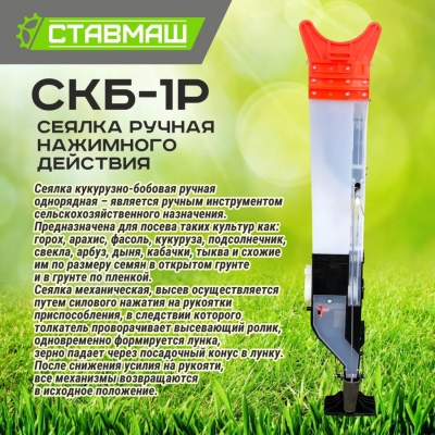 Сеялка нажимная однорядная СКБ-1Р предназначена для посева различных культур таких как горох, арахис, фасоль, кукуруза, подсолнечник, свекла, арбуз, дыня, кабачок, тыква. Она подходит как для открытого грунта, так и для грунта под пленкой. Высев осуществляется путем силового нажатия на рукоятки, в результате чего толкатель проворачивает высевающий ролик и формируется лунка. Зерно попадает через посадочный конус в лунку. Можно высевать по 1, 2 или 3 семени в лунку одновременно, регулировка происходит путем перестановки заслонки. Глубина заделки семян регулируется от 40 до 75 мм. Сеялку СКБ-1Р можно приспособить для посева практически любых культур, что делает ее универсальным инструментом для садоводов и фермеров.