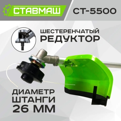 Бензиновый четырехтактный триммер Ставмаш СТ-5500 с удобной эргономичной рукояткой велосипедного типа с курком газа. Ширина скашиваемой области составляет до 420 мм, при использовании полуавтоматической шпули с леской, 255 мм при кошении диском или фрезой, имеет неразъемную усиленную штангу Ø 28 мм с кованным стальным валом со шлицами, что увеличивает надежность инструмента.. 4-х тактные ДВС подвержены меньшим вибрациям, малошумные, экономичны и выделяют гораздо более чистый выхлоп, работать таким триммером комфортно и удобно. Лучшая смазка, меньшие нагрузки на ЦПГ увеличивают моторесурс в сравнении с двухтактниками в два - три раза.