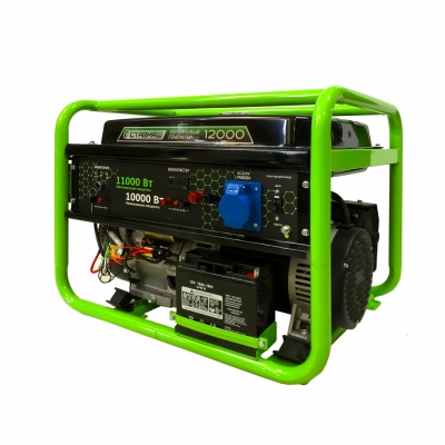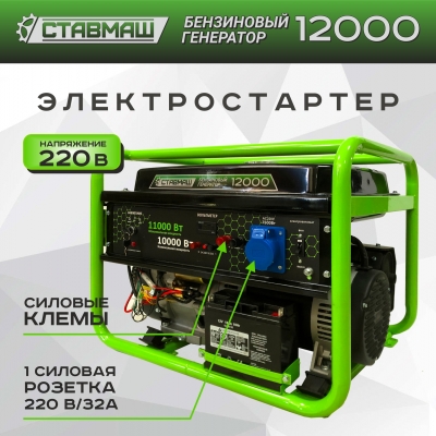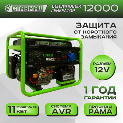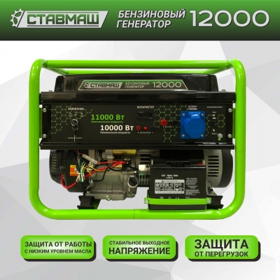 Ставмаш 12000 - бензиновый генератор синхронного типа, с четырехтактным двигателем и суммарной мощностью подключаемых потребителей 12000 Вт.