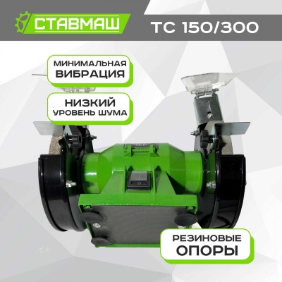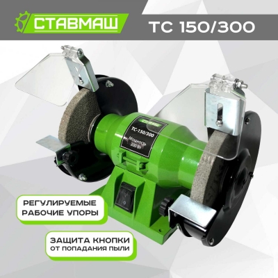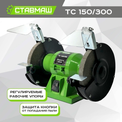 Заточной станок Ставмаш СТ-150/300 предназначен для затачивания режущих инструментов при помощи вертикально вращающихся заточных дисков. Модель оснащена асинхронным двигателем мощностью 300 Вт. По обе стороны от двигателя установлены заточные диски диаметром 150 мм и шириной 20 мм с различной зернистостью. Абразив диска используется для восстановления эксплуатационных свойств ручного инструмента, такого как ножи, топоры, стамески и т. п.; для снятия заусенцев, фасок, обдирки на небольших заготовках. Оба диска оснащены защитными кожухами (листовая сталь), искрозащитными экранами (пластик). Основание станка выполнено из качественного металла, что обеспечивает прочность и устойчивость. На переднюю часть станины выведен выключатель. Имеются отверстия для крепления к верстаку.