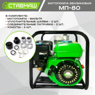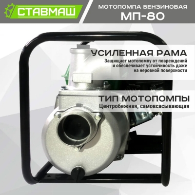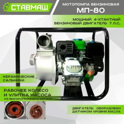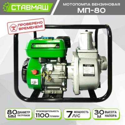 Ставмаш МП-80 - мотопомпа с четырехтактным двигателем, производительностью 1100 л/мин, глубиной всасывания 10 м и высотой подачи 35 м.